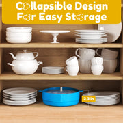 This popper is collapsible, so you can store it basically anywhere in your kitchen. The diameter of this product is 9.4 inches, the original height is 5.7 inches, and the folded height is 2.3 inches. It saves space for storage after folding. Perfect for traveling and a great space saver for college dorms.